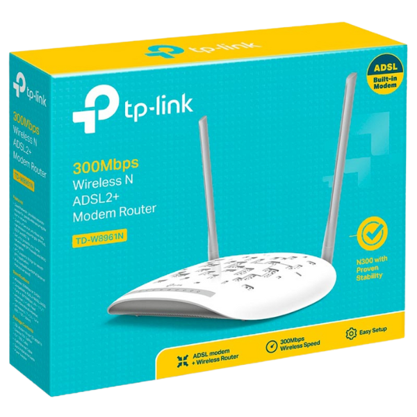 مودم 8961 ترکیبی از فناوری ADSL2+، یک روتر بی سیم و یک اکسس پوینت است که به کاربران این امکان را می دهد به اینترنت پرسرعت متصل شوند. این مدل از تعدادی نشانگر LED بهره برده که وضعیت کارکرد دستگاه، اتصال اینترنت، وضعیت شبکه و… نمایش می دهد. مودم تی پی لینک 8961 از دو آنتن خارجی ثابت با قدرت 20 دسی بل برخوردار است که اطلاعات را با سرعت 300 مگابایت بر ثانیه به صورت بی سیم انتقال می دهد. همچنین حداکثر سرعت DSL برابر 24 مگابایت بر ثانیه می باشد. این مودم بی سیم برای کاربری خانگی یا دفاتر کوچک به ویژه برای بازی های آنلاین مناسب است و قابلیت رمزگذاری WPA2-PSK / WPA-PSK را در اختیار شما قرار می دهد.